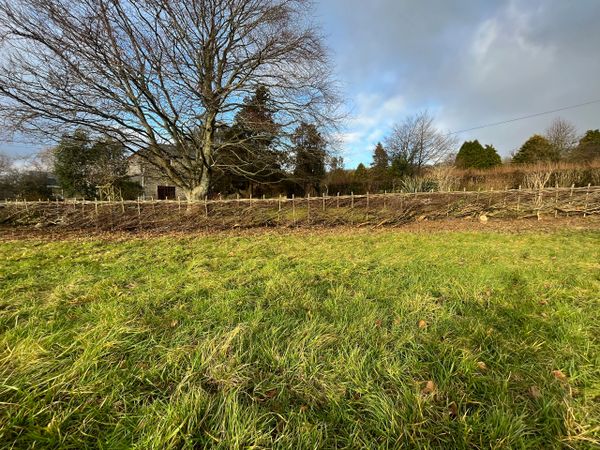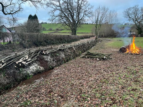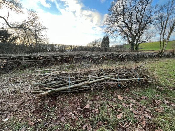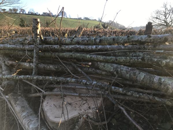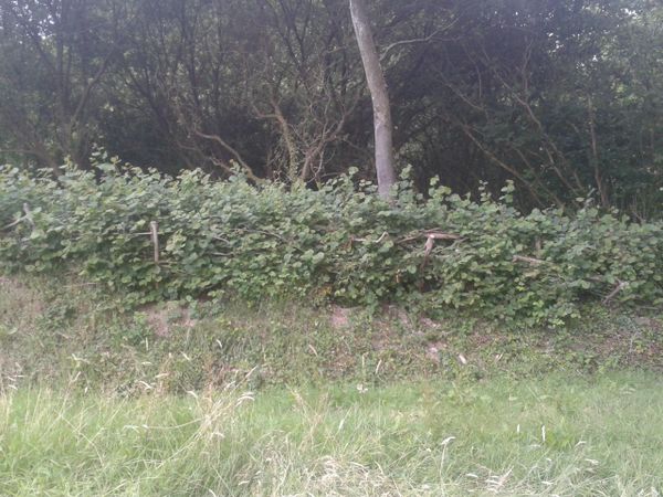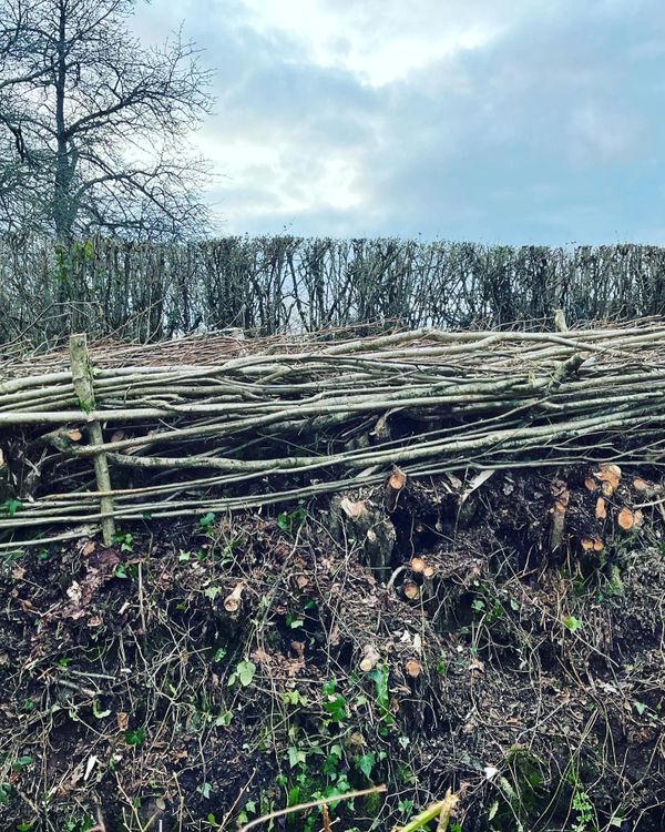 The art of hedge laying is to partially sever and lay over the stems which once secured by steaks, form a barrier.